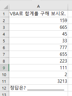 하지만 엑셀에서 사용하던 함수들을 모두 사용할 수 있는것이 아닌데다 엑셀에서 기본함수라 할 수 있는 SUM()함수도 VBA에는 없습니다. 아래 데이터의 합계를 VBA로 구하려면 어떻게 해야할까요??